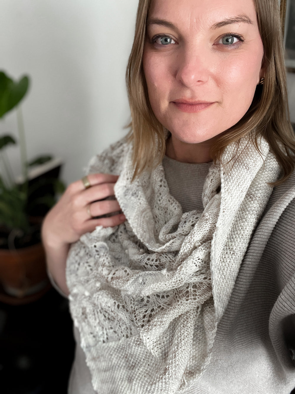 The Berry Scone Shawl is meant to be the perfect companion to an afternoon of reading and tea guzzling. It’s just big enough to wrap you up in warmth without being so big that it gets unwieldy. The bobbles that break up the rows of lace are a deliberate echo of the little red spots of berry in my favorite scones.