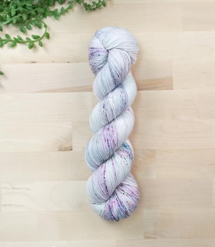 Sparkle Fingering: 75/20/5 Superwash Merino/Nylon/Stellina; 438 Yards; 100 grams. A strong spun sock weight yarn with a tiny hint of glimmer spun into the yarn.