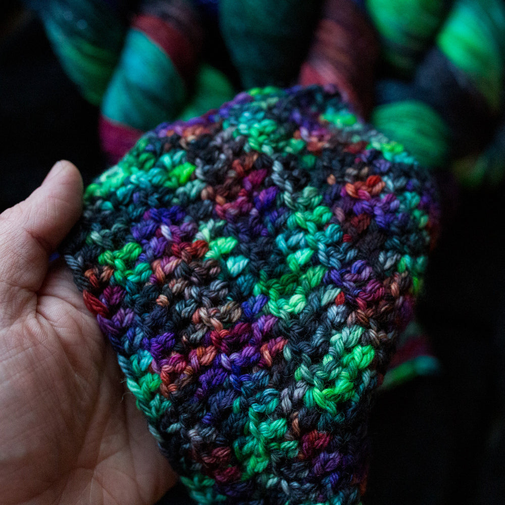 Northern Lights is an Alaska yarn. Inspired by our painted night skies, this colorway flows between black, bright green, purples, pinks, and dusty red.