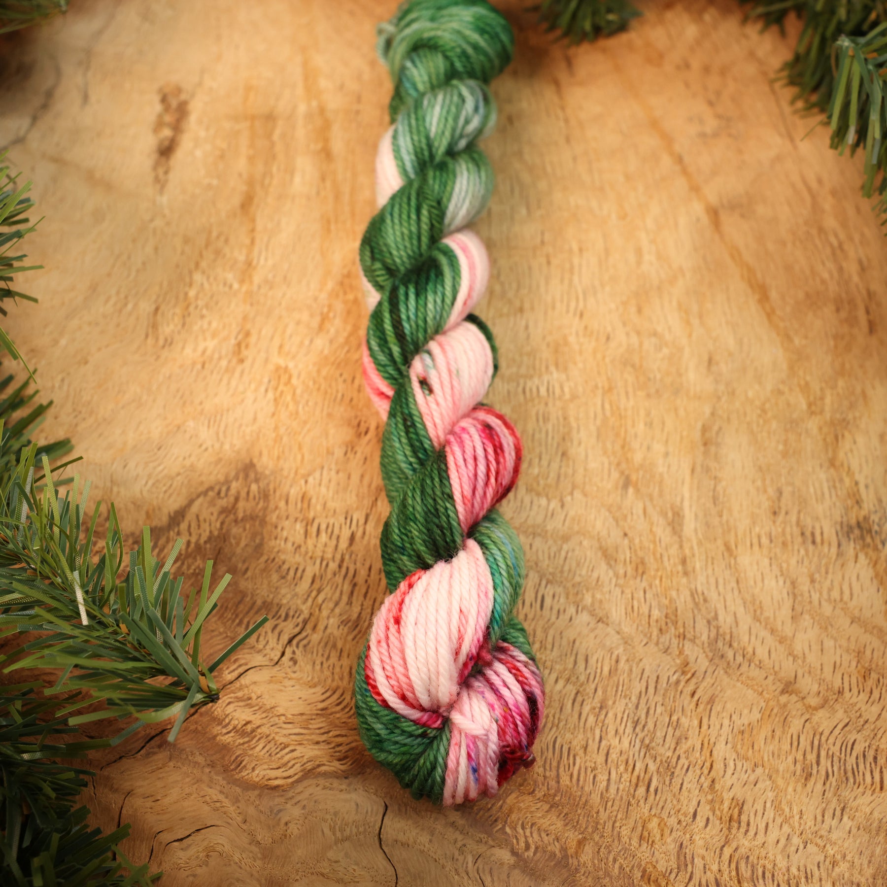 DK Mini: 75/25 Superwash Merino & Nylon; 49 Yards; 20 grams.This is a mini skein. of our DK weight yarn.