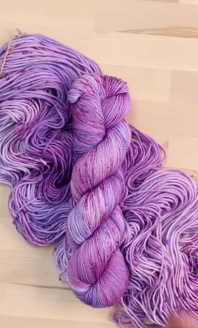 💜 Amethyst Quartz is Bad Sheep Yarn's February Colorway. This stunning purple-hued colorway is sprinkled with blue and crimson speckles. Check out the rest of our Birthstone Colorways.