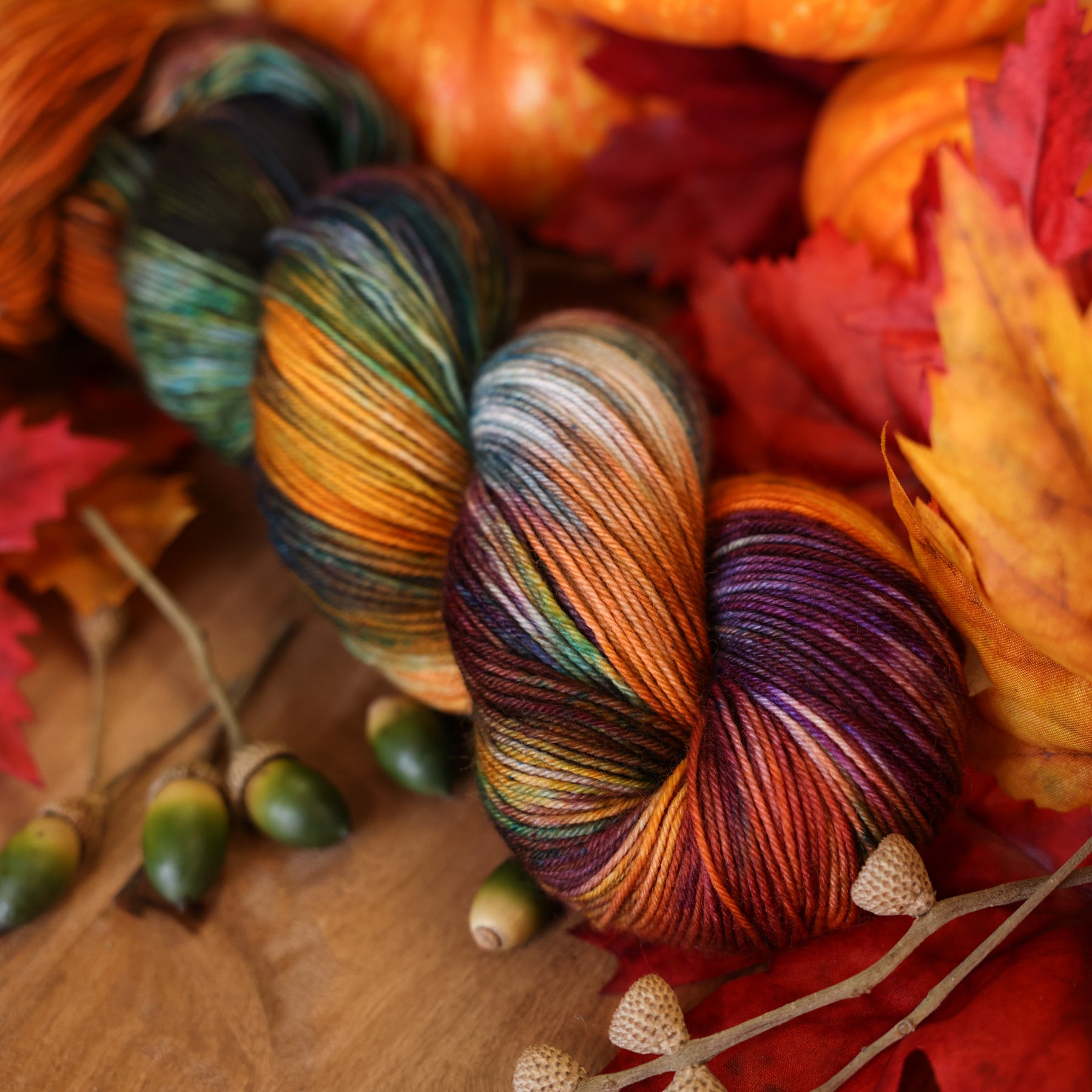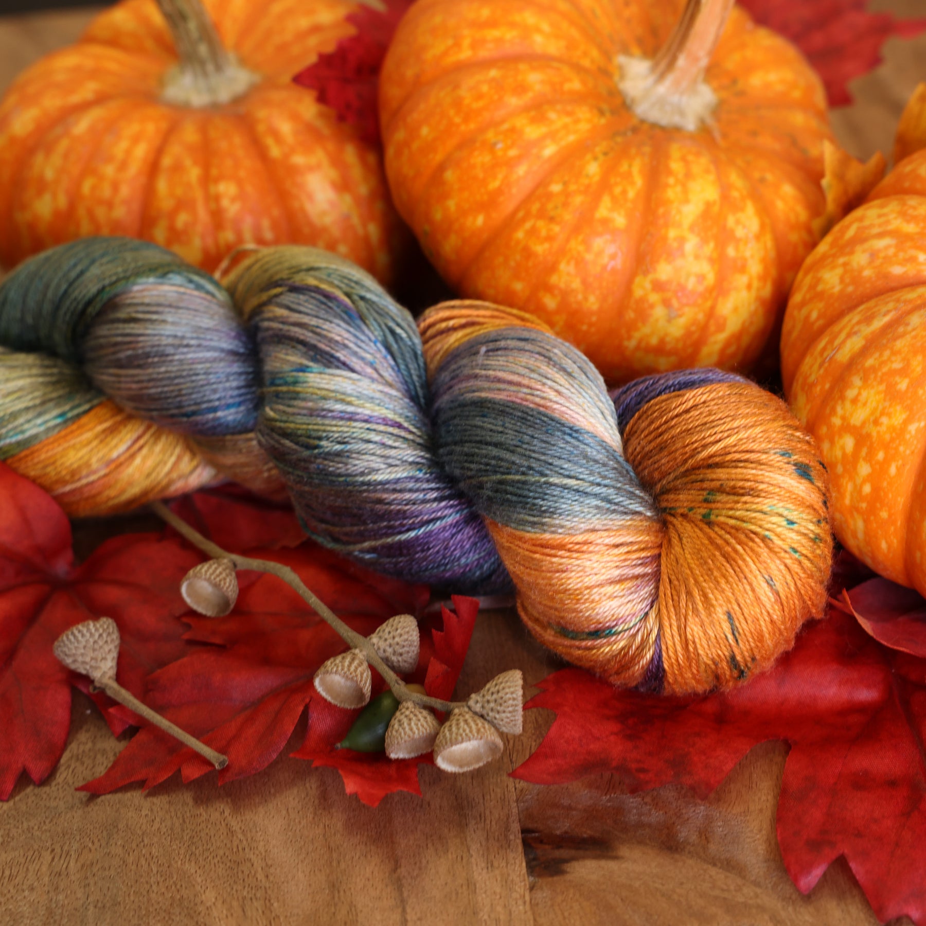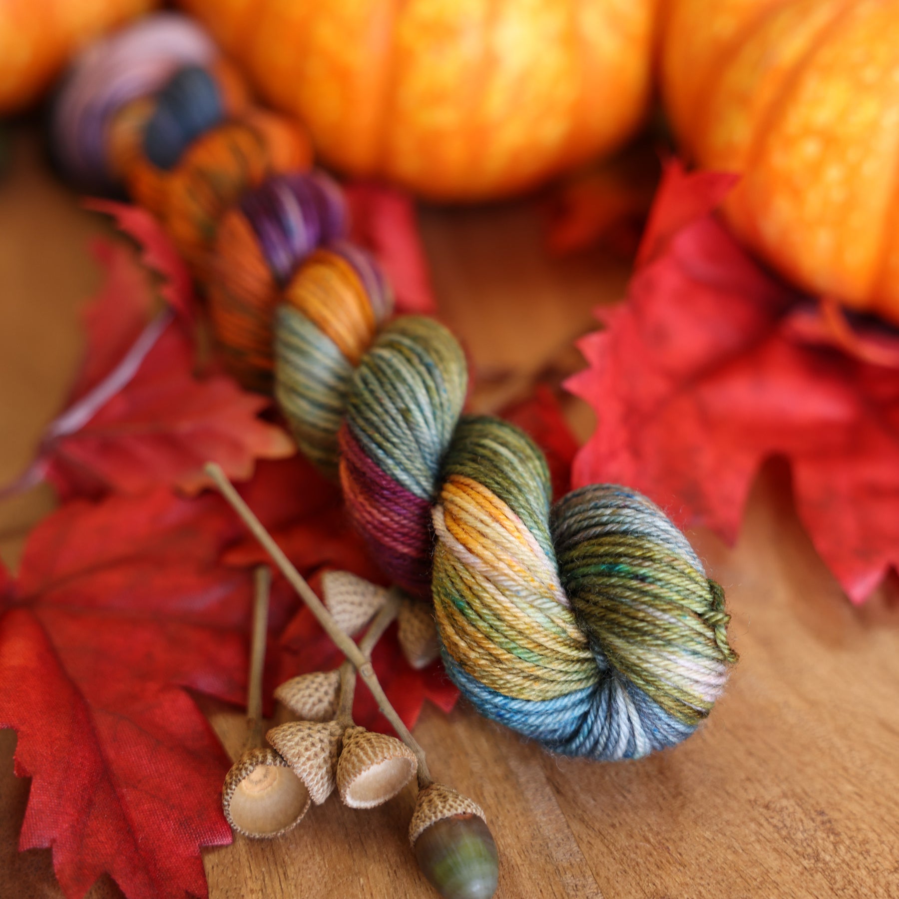 Mini Fingering skein of Upstate yarn on table with fall decor.