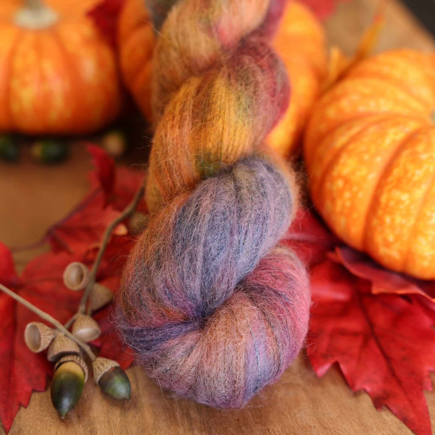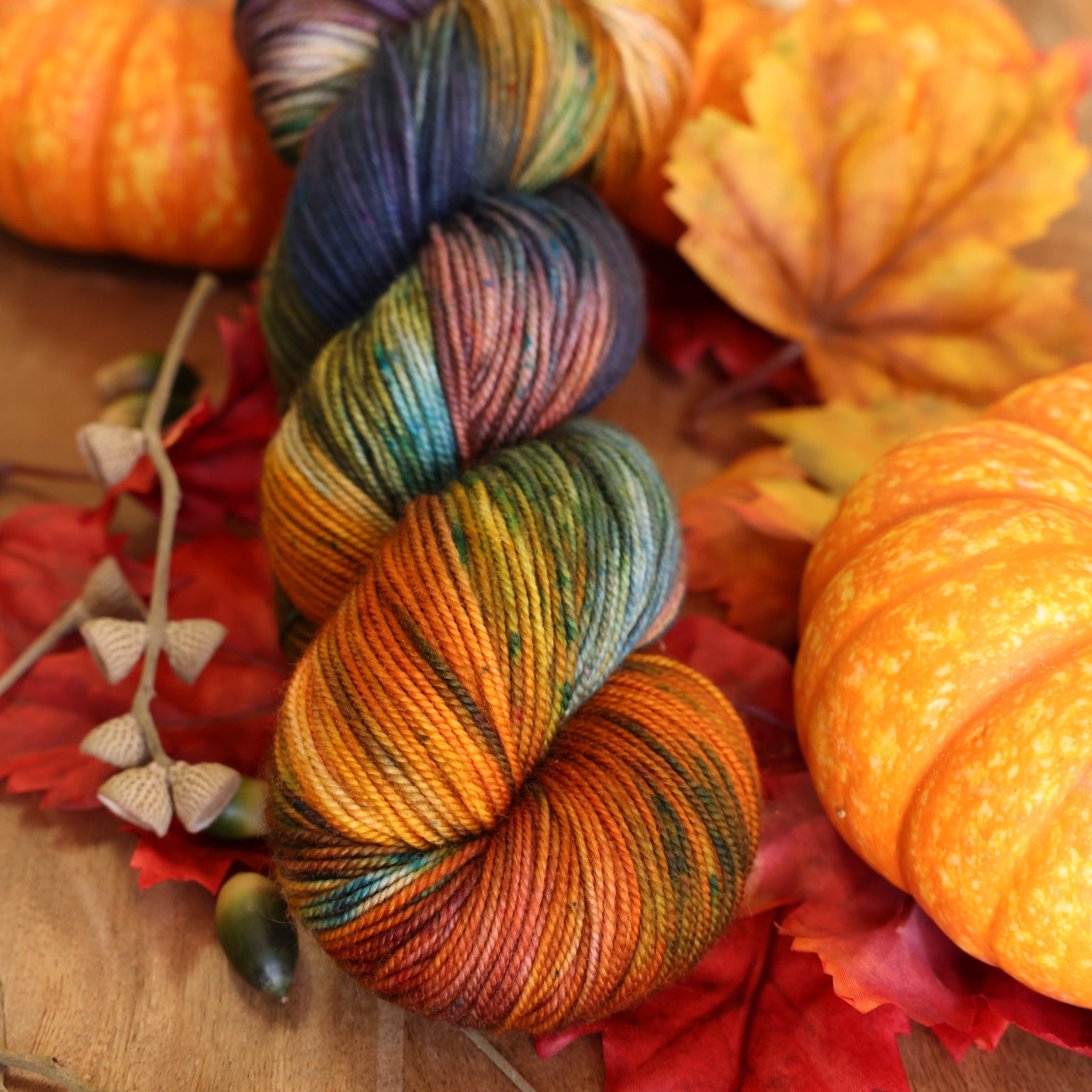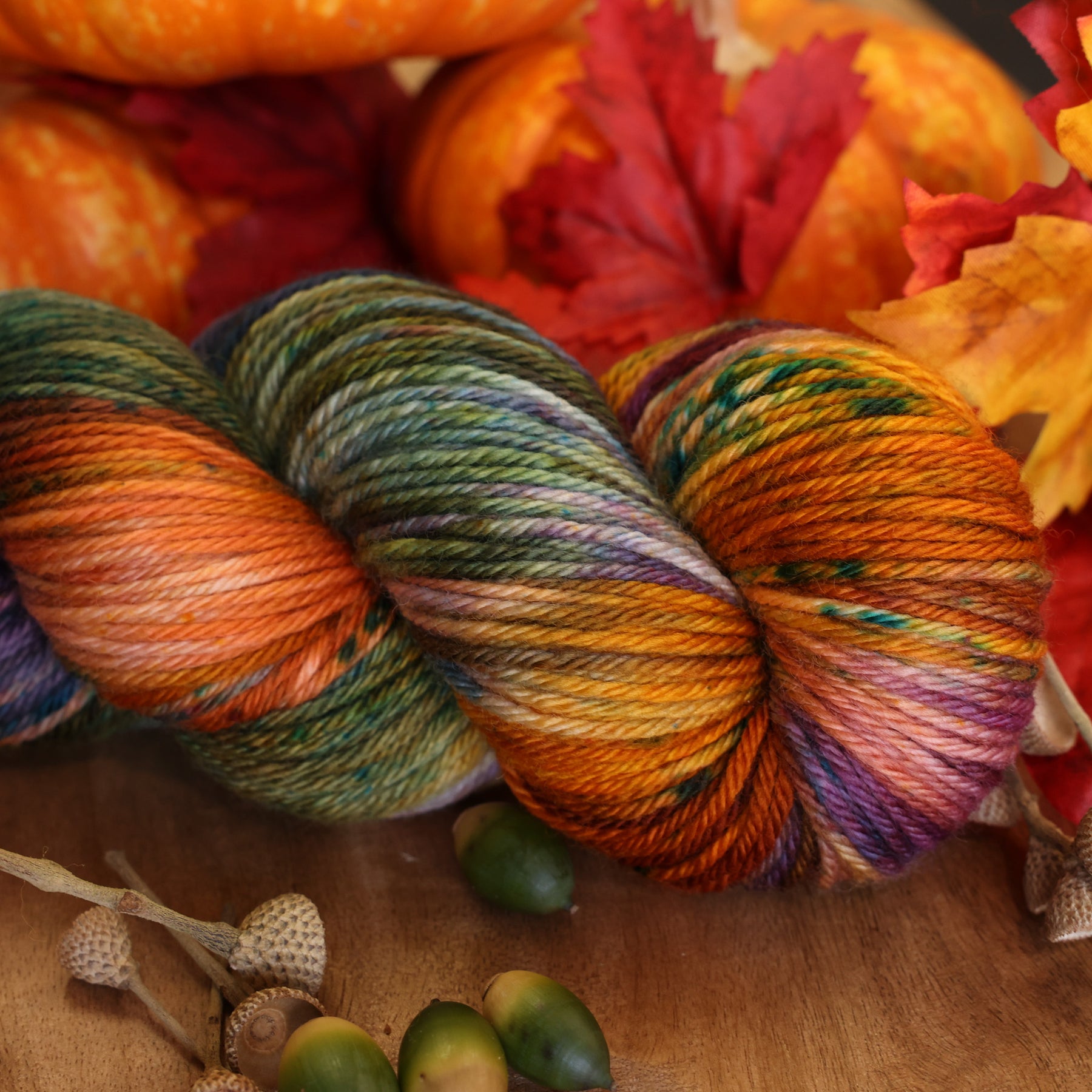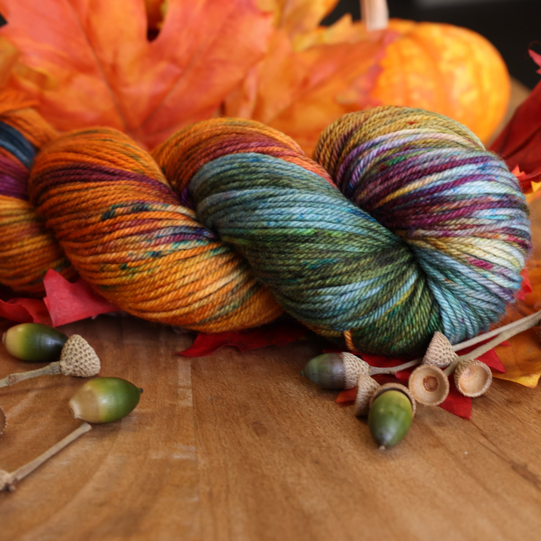 Mini Fingering skein of Upstate yarn on table with fall decor.
