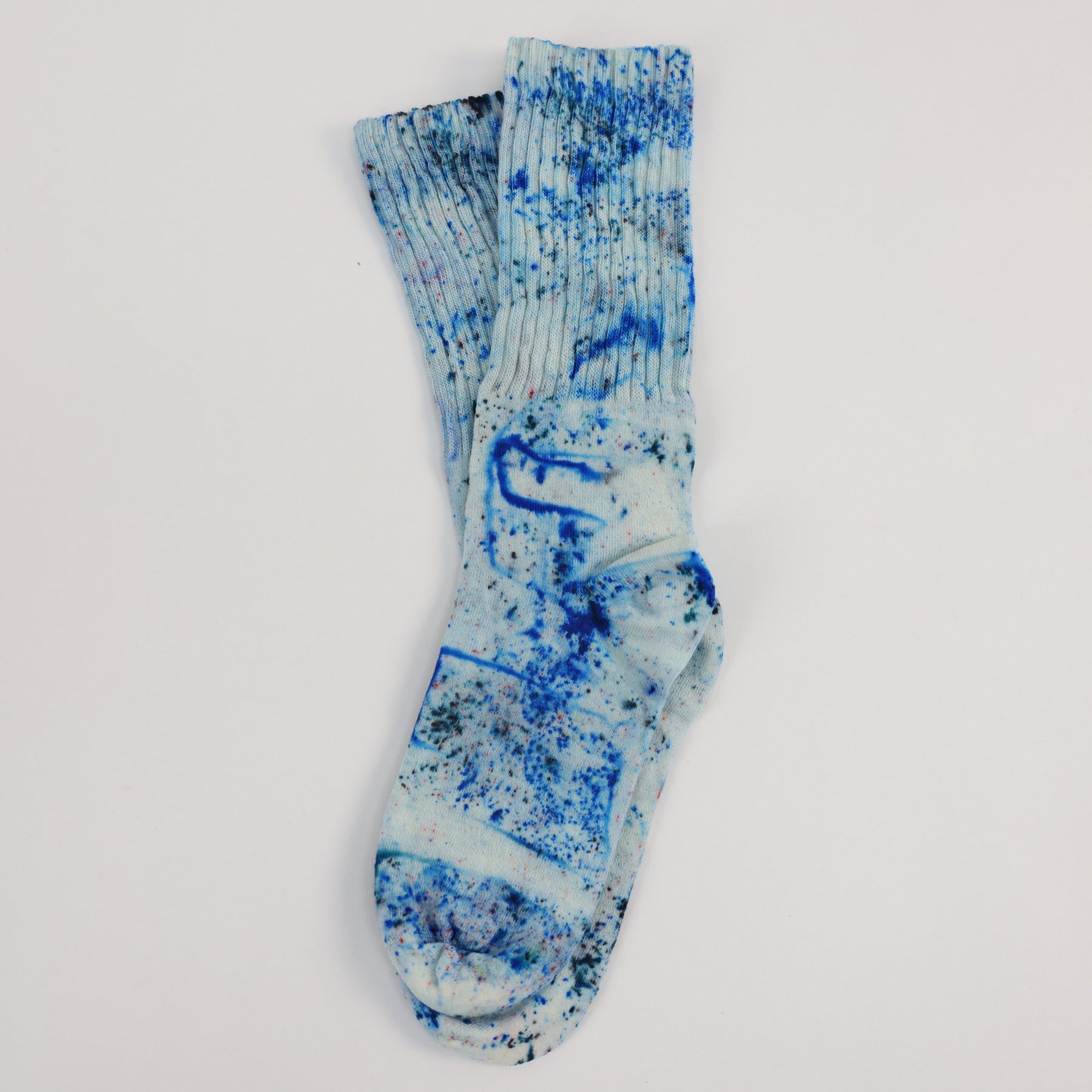 Frosty blue and grey speckles blizzard across a light blue merino wool base. These socks can also have some red speckles.