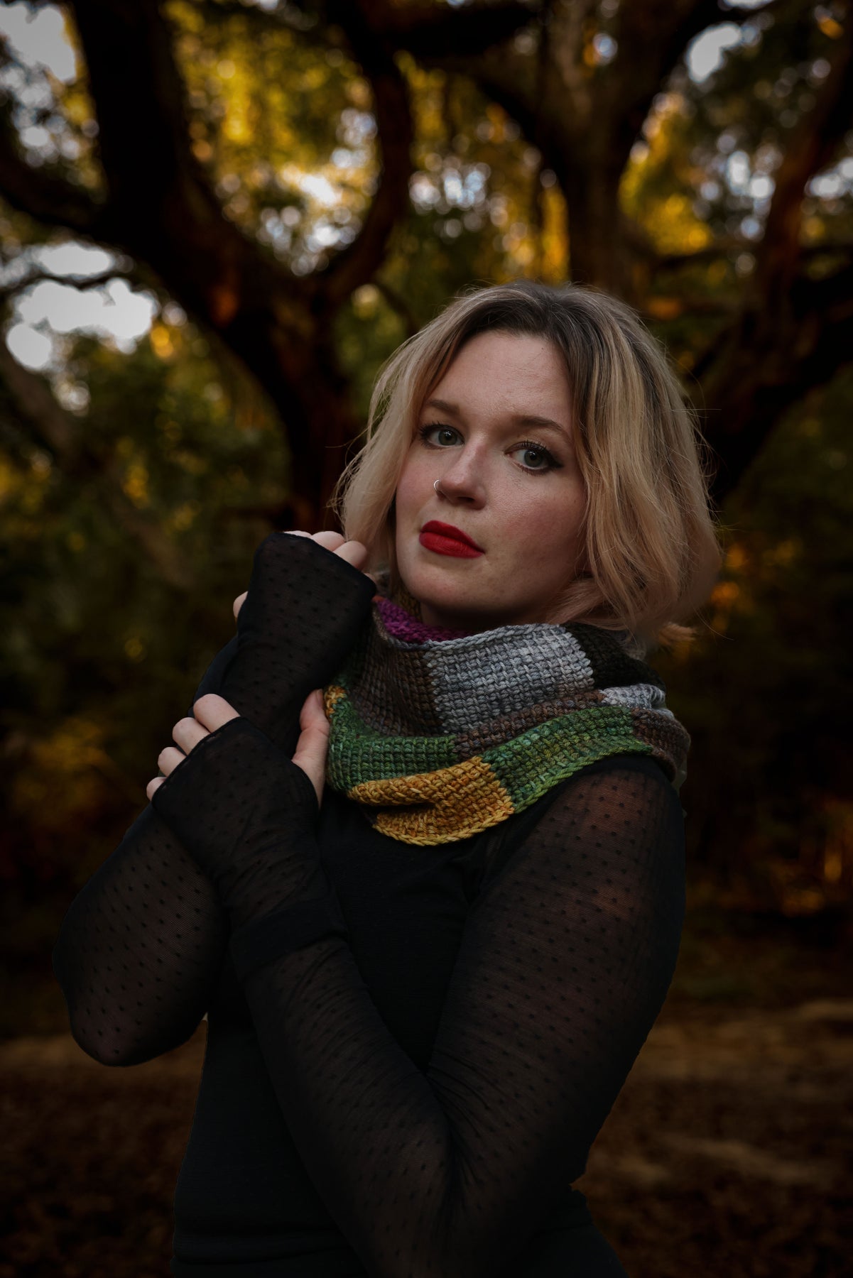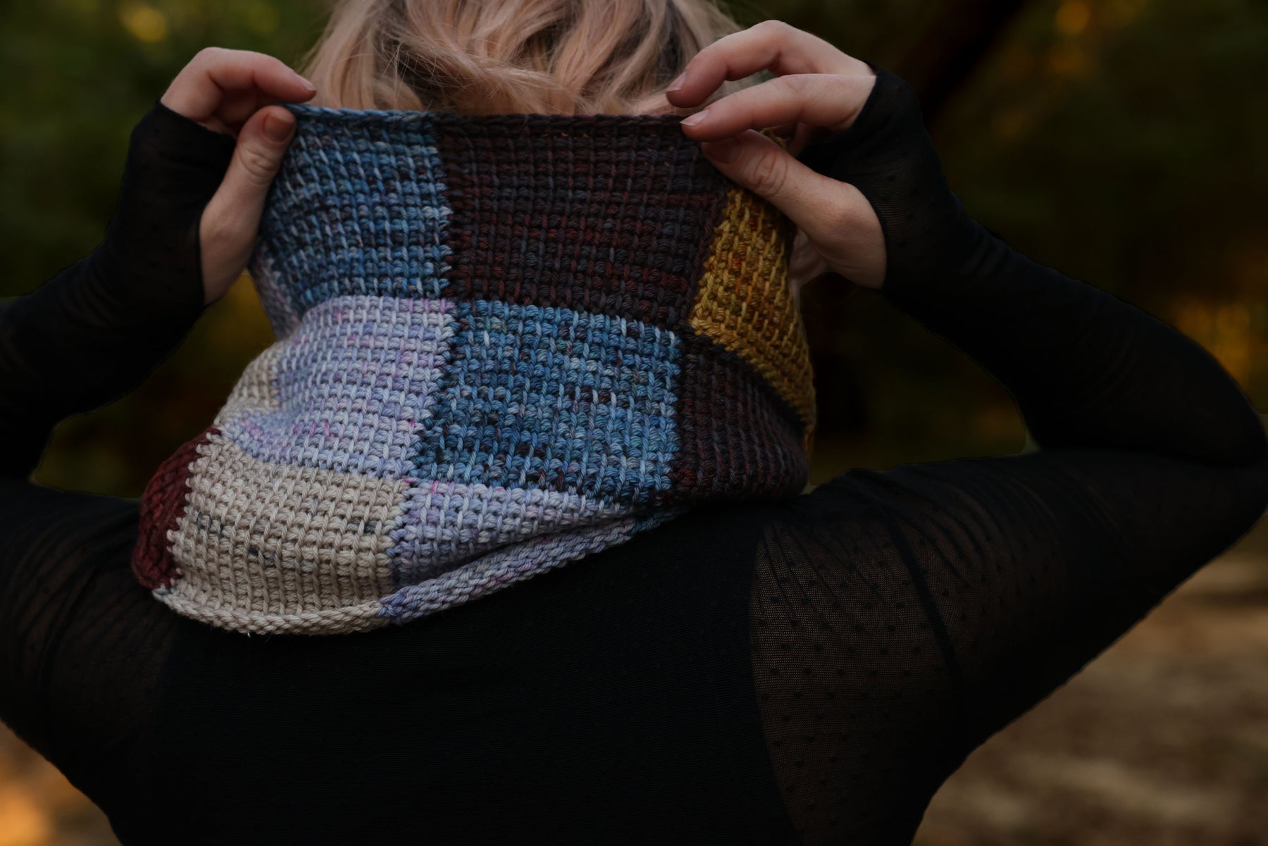 The Spirited Away Cowl is a gentle journey in Tunisian crochet—dreamy, colorful, and full of quiet magic. Worked in soft entrelac panels using DK yarn and a simple straight hook, each stitch flows into the next like a drifting breeze.