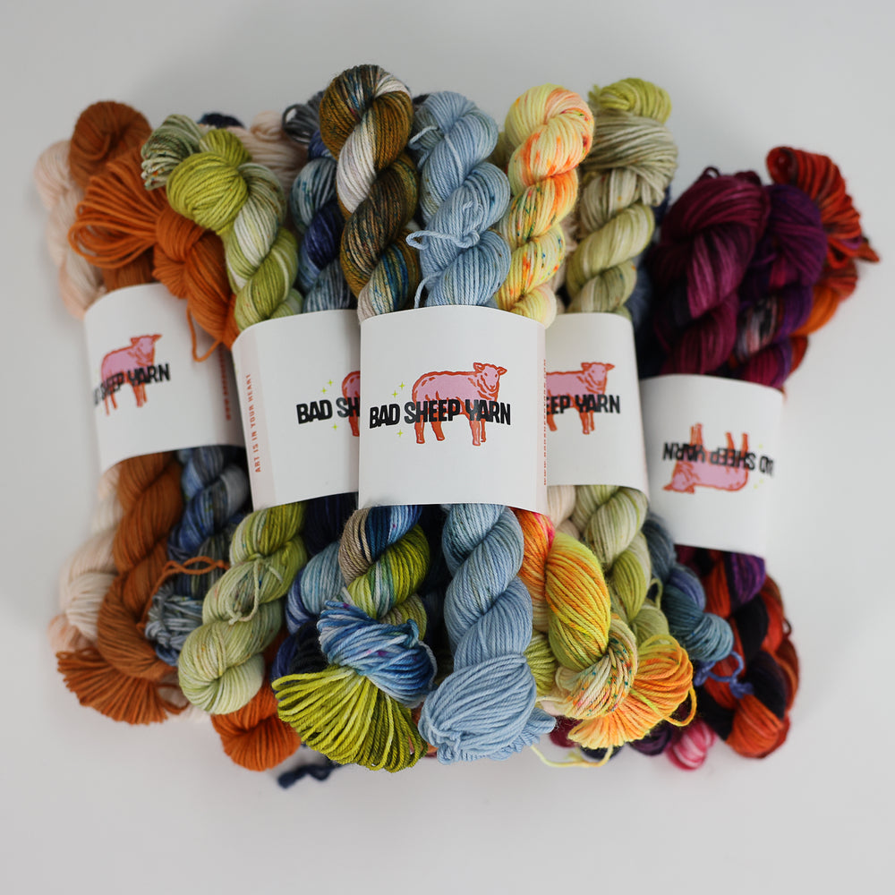 Our Flopsy Bundles are mystery kits made up of skeins that didn't quite meet our standards, were tester skeins that didn’t make the final cut, or are simply one-off creations. These bundles are perfect for crafters who love a good deal and don’t mind a little imperfection!