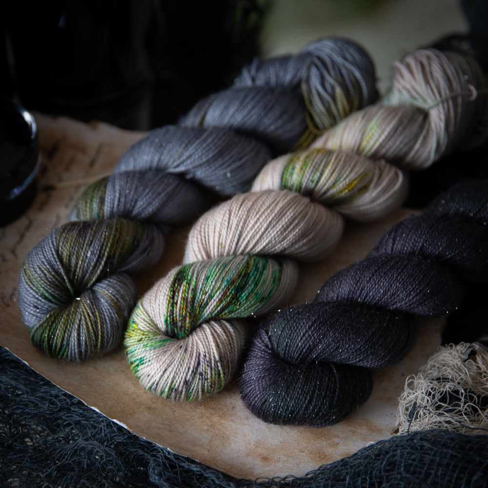 The Edgar Allan Poe Set is a 3 skein collection of dark and eerie colorways. Each named after a piece of work by the famous poet, Edgar Allan Poe. In this set is a full 100 gram skein each of Nevermore, William Wilson, and Ulalume.