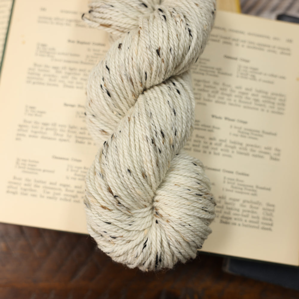 🍨This is our tweed base on its natural form. The last time we released our tweed base, we had so many requests for the lightest white and this is the best we can do! Creamy wool in its natural form with tan, brown, and black donegal tweed neps.