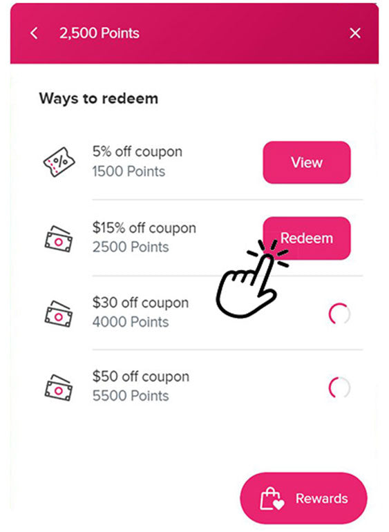 Just click "Way to Redeem" and select your reward. Make sure to click "Apply code" and your discount will be waiting at checkout.
