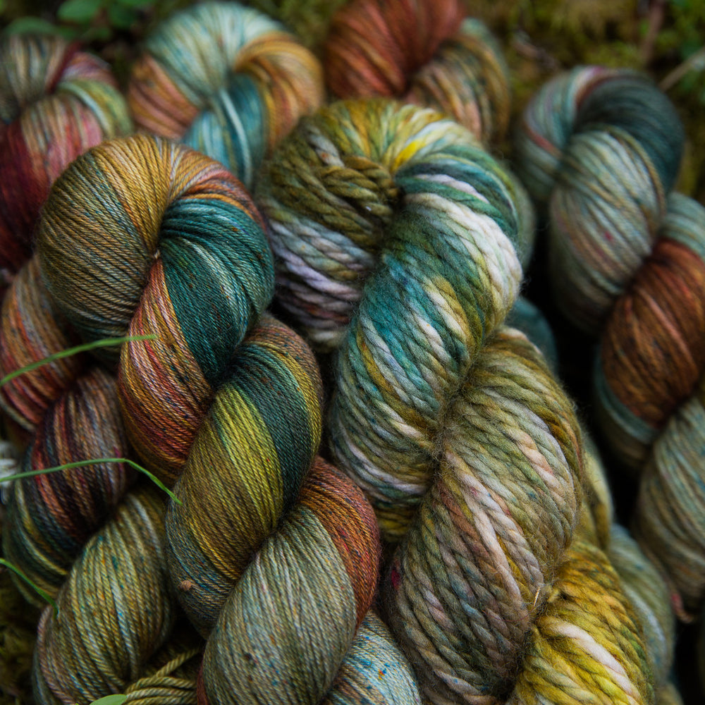 Part of the Alaska 2021 Collection, Mountain Tundra is a stunning colorway of earthy greens, golds, and brick reds, teals, and speckled accents is made to resemble the colors of the mountains.